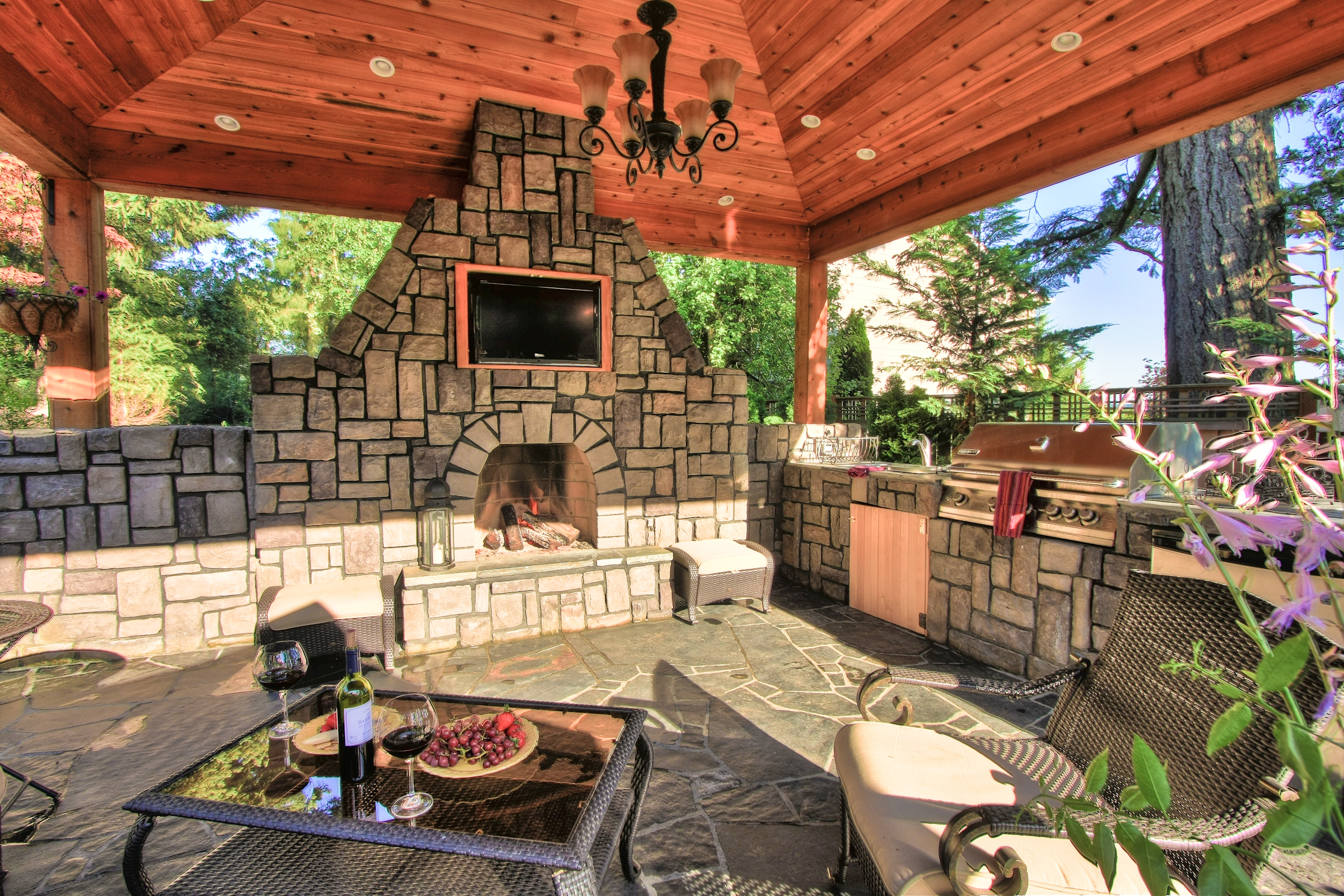 - Зона для приготовления пищи: мангал или камин, печь, гриль, казан, костровище