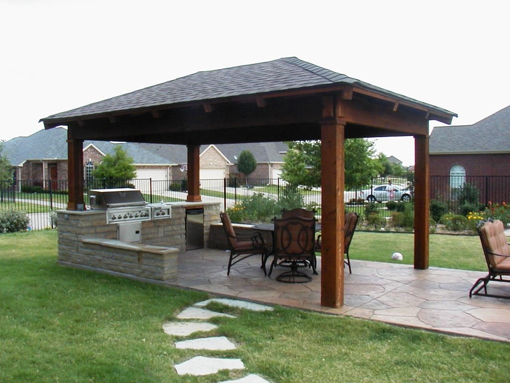 Отдельный вариант крытой зоны — павильон или беседка. Их строят на небольшом расстоянии от мангальной зоны и защищают от дождя, ветра или солнца, огородив с трёх сторон стенками.