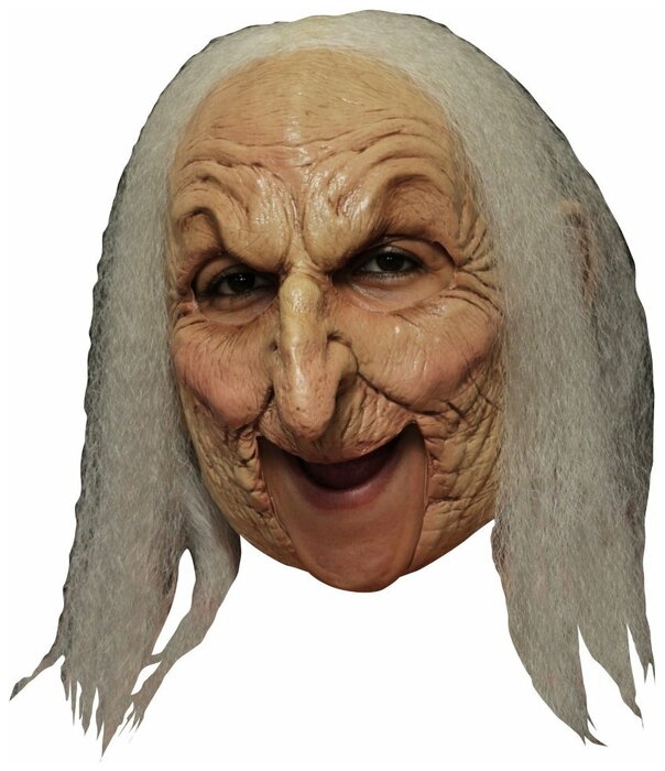 Примеряем маску и думаем нужна ли нам нижняя челюсть. Обычно ведьма получается вполне убедительная и в пол-лица, но если сделать подбородок – будет реальный убой! Но есть нюанс — голос становится глуховатым и шамкающим. Но роли это не противоречит.