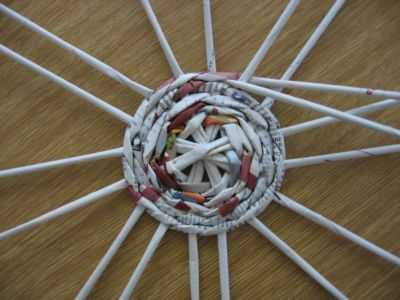 - Берем палочку или карандаш и делаем между переплетами отверстия. Вставляем по 2 дополнительные трубочки на каждое отверстие. Проплетаем 1 ряд и вновь разделяем двойные трубочки.