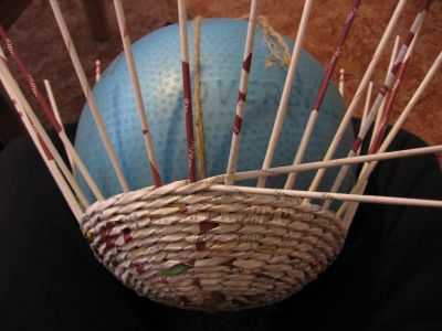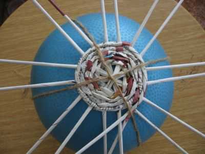- Укладываем шар себе на колени и продолжаем плести. Плотно прижимайте трубочки к шару, чтобы плетение получилось ровным и красивым.