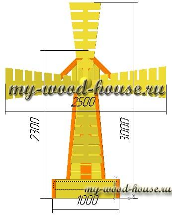 Если же для сада требуется нечто большее, то можно попытаться сделать полноценную мельницу – беседку по чертежу, приведенному ниже.