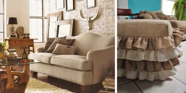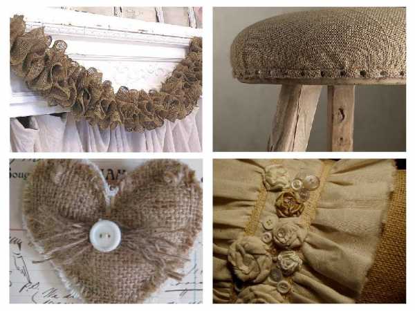 Одним из самых популярных сегодня решений является сегодня простая и грубоватая мешковина в интерьере деревенской и сельской классики разных стран: русском этно, кантри, прованс, шэбби-шик (на фото выше). Нестандартная фактура ткани «для мешков» подчеркивает очаровательную небрежность и демократичность этих направлений и становится гармоничным дополнением к характерным для этих стилей отделочным материалам.