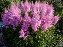 - Астильба. Это теневыносливое растение с высокими соцветиями-метелками растет пышными кустами с резной листвой. Астильба отличается продолжительным цветением, очень декоративна, сохраняет свою красоту с июня до сентября.