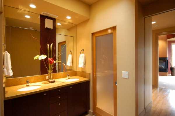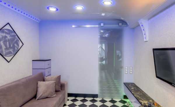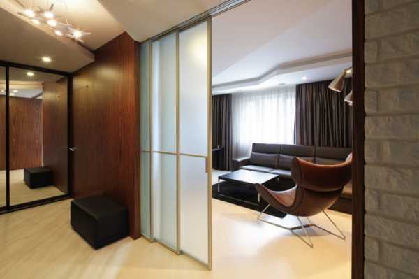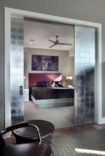 Согласитесь, что распашная дверь в открытом состоянии занимает немало полезного пространства комнаты, да и на само открывание необходим определенный запас площади. В малогабаритных помещениях дизайнеры предлагают использовать вариации раздвижных дверей. Первый способ создания такой конструкции – размещение дверного полотна между двух рельс, которые крепятся к потолку и полу. В результате мы получаем раздвижное полотно, действующее по принципу дверей в купе. В последнее время этот способ создания изолированности помещения упростили до одной подвесной рельсы или штатива, который крепится к стенам над дверным проемом. Таким образом, можно экономить пространство небольших помещений, но важно понимать, что вплотную к стене в месте перемещения дверного полотна мебель или другие предметы интерьера установить нельзя будет.