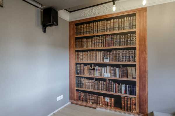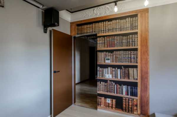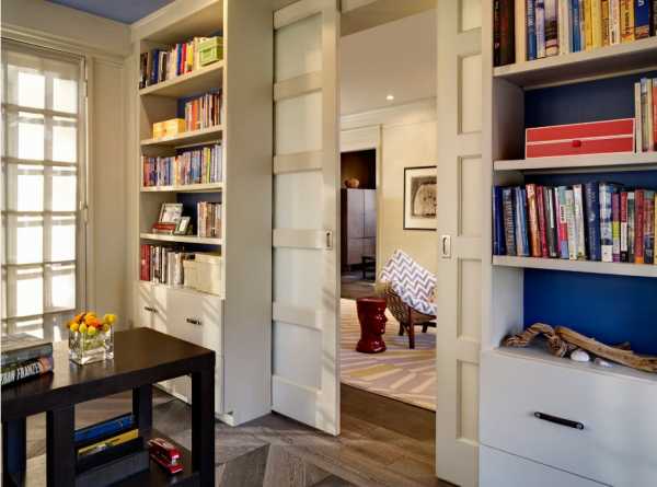 Еще одной конструкцией межкомнатных дверей, о которой нельзя не упомянуть, является дверь-стеллаж. Отличаясь не столько по типу открывания, сколько по самому внешнему виду, такие двери можно встретить на входе в гостиную, выполняющую и функции библиотеки или кабинет. Дверь с открытыми полками чаще всего используется для хранения книг и потому имеет достаточно большой вес, что усложняет не только всю конструкцию, но и требует определенных свойств от фурнитуры.