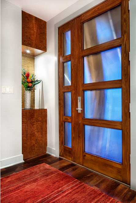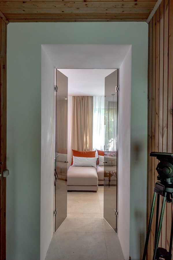 Все эти варианты дверей, выполненных из различных материалов, могут быть представлены как в глухом виде (филенка), так и со стеклянными вставками. К слову о стекле, как материале для исполнения дверных полотен. В современных дизайн-проектах все чаще можно встретить двери, выполненные исключительно из стекла, без рамок и профилей. Такие конструкции смотрятся легко и свежо, привносят в интерьер не только мотивы индустриальности, технологичности, но и возможность визуального расширения пространства. Двери из каленого, безопасного для человека стекла (даже если такое полотно разбивается, чего непросто добиться, человек не сможет пораниться осколками из-за защитной весьма прочной пленки) практически не препятствуют проникновению света, что позволяет сохранять иллюзию простора даже при изоляции помещений.