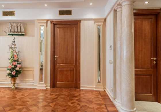 Классическому дизайну интерьера квартиры соответствуют модели межкомнатных дверей, изготовленных преимущественно из натурального дерева или материала, имитирующего древесину. Такие образцы отличает изысканность линий, благородные светлые или темные тона. Комфортно в классике будет смотреться дверь цвета венге, символизирующего роскошь и величие. Дверные полотна классического стиля характеризуются наличием различных декоративных переплетов, изящно оформленных филенок и использованием вставок из цветного стекла (витражей). Ручки и фурнитура для дверей подбираются под стать стилю. На фото представлены примеры классического исполнения дверей.