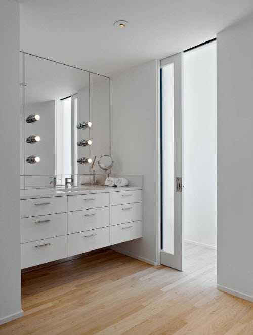 Они убираются в стенную нишу и не занимают стену. Прекрасно смотрятся как в классическом стиле, так и в минималистическом интерьере.