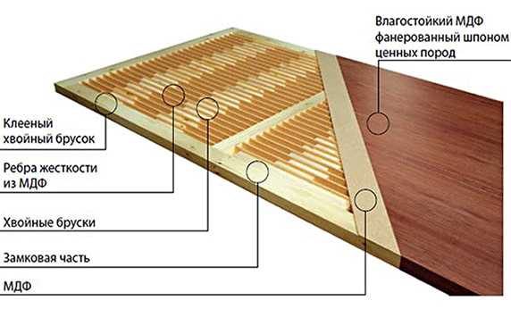 - Материал дверного полотна. Все чаще встречаются случаи, когда выбор производится в пользу дверных полотен, собираемых не из цельного массива древесины, а из МДФ-панелей. По экологичности двери из МДФ, конечно, проигрывают изделиям из дерева, но стабильность их размерных характеристик, не зависящая от влажности исходного сырья (как для изделий из дерева), делает свое дело.