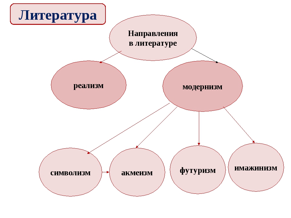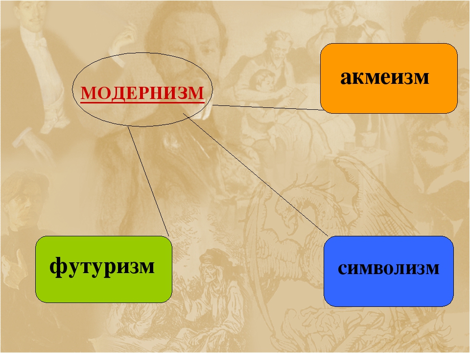 Когда говорят о русской литературе конца XIX начала XX века, то в первую очередь вспоминают о трёх течениях, которые были самыми яркими: о символизме, акмеизме и футуризме. Объединяет их то, что они относились к модернизму. Модернистские течения возникли как противопоставление традиционному искусству, идеологи этих течений отрицали классическое наследие, противопоставляли свои направления реализму и провозглашали поиски новых способов изображения действительности. В этих поисках каждое из направлений шло своим путём.