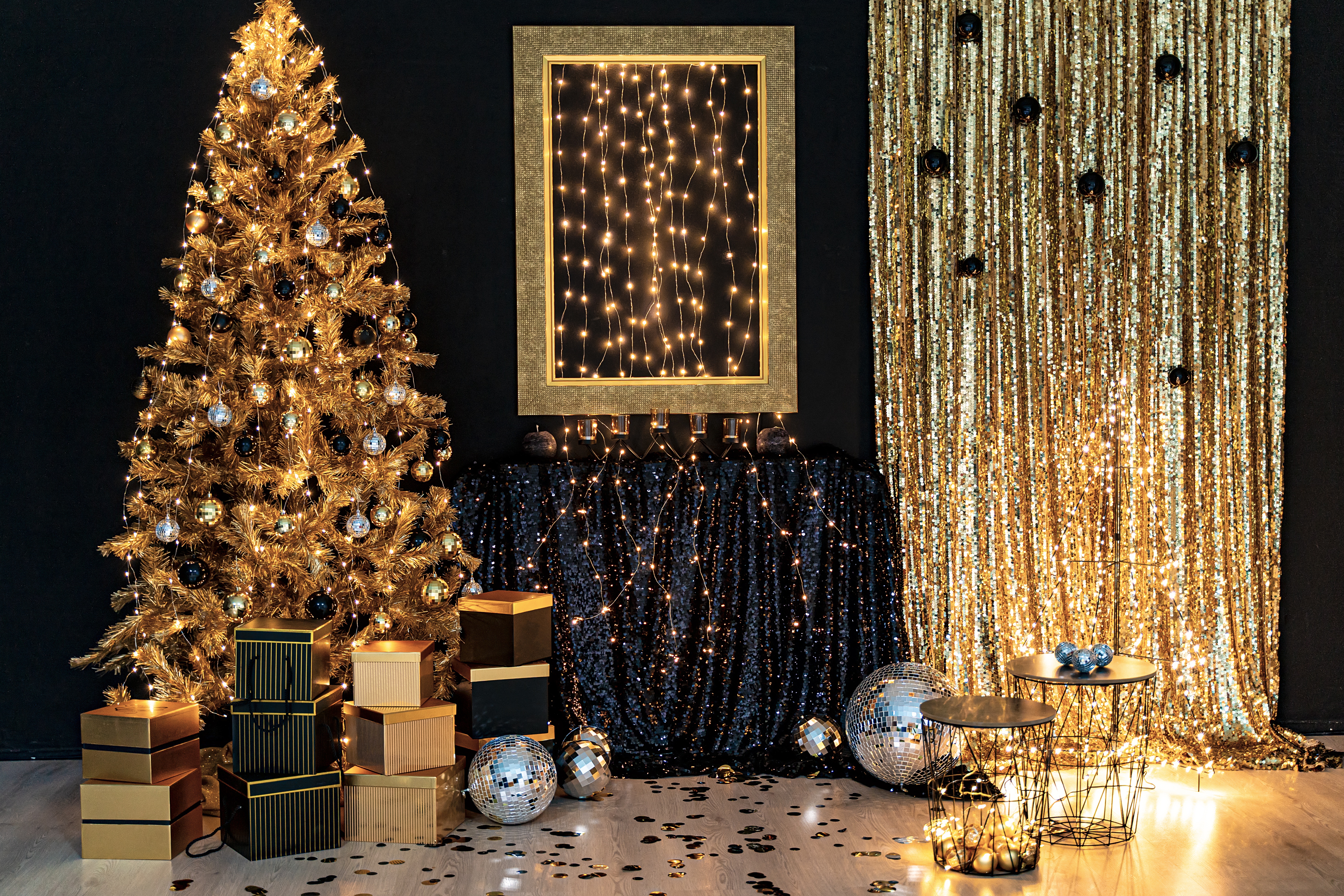 Ничто так не говорит о современном гламуре, как блестки.Эта юбка из золотого дерева моментально выведет ваш праздничный декор на новый уровень.