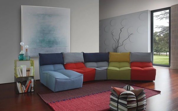 Модульные системы в тренде уже пару сезонов, и в текущем не собираются сдавать позиции, а все благодаря многофункциональности и эффектности этих моделей. Они способны любую гостиную превратить в кинотеатр, как на фото, или центр мозгового штурма. Благодаря легкому передвижению элементов, за считанные минуты могут перевоплотиться из удобного для обсуждений полукруга, в широкий плацдарм для сна.
