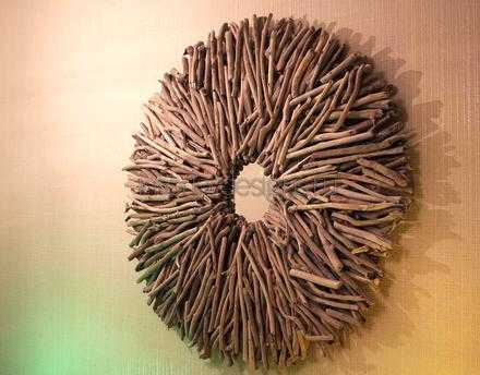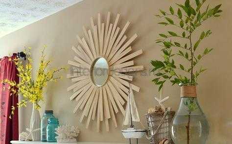 Очень необычно в любом интерьере смотрится зеркало-солнце. Для его изготовления понадобятся деревянные брусочки (веточки деревьев), оправа из фанеры по размеру изделия, грунтовка, клеевой пистолет, клей по дереву, аэрозольная краска, наждачная бумага.