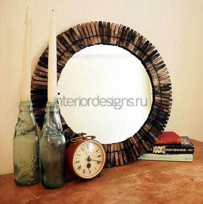 В любой интерьер можно установить зеркало в виде солнца, оно будет смотреть очень оригинально. Для украшения зеркала вам необходимы брусочки дерева (можно взять ветки дерева или деревянные прищепки), оправа из фанеры, исходя из размеров изделия, наждачная бумага, клей и клеевой пистолет, грунтовка и аэрозольная краска.