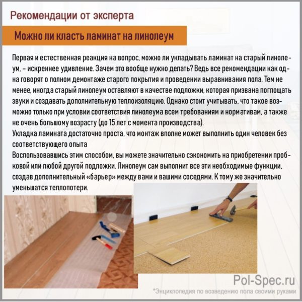 Укладывать ламинат на такую поверхность допускается только в том случае, если линолеум прочно закреплен, не имеет повреждений, а пол под ним ровный. Если это не так, придется его срывать и выравнивать поверхность.