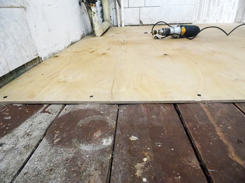 Например, в ванной комнате, которая пострадала от воды, старый фанерный или OSB черновой пол может быть удален до балок, уложен новый черновой пол, затем уложена подложка из цементных плит и, наконец, новое напольное покрытие из керамической плитки.