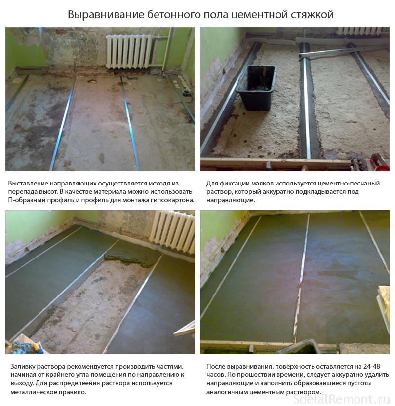 Чаще всего бетонные полы встречаются в городских квартирах, где черновой пол состоит из железобетонных плит. Этапы по выравниванию будут следующими: