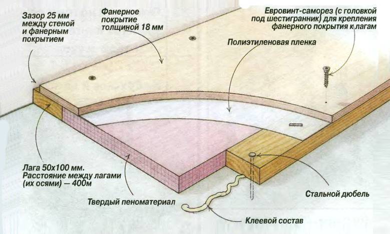 Считается более дорогим, но относительно простым. Предварительно, все трещины/сколы шпаклюются. Затем, основание застилается специальной пленкой — первым слоем гидроизоляции. По периметру натягивается кромочная лента. На поверхность выкладывается керамзитная крошка, на нее — листы ГВЛ, фанеры или ДСП. Листы крепятся между собой с помощью клея (специальные замки тоже встречаются, но реже), а потом — укладываются в шахматном порядке, чтобы швы не пересекались.