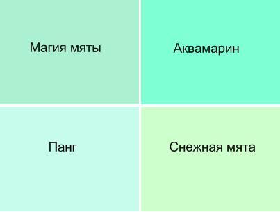 Вариациями мятного называют такие цвета, как «аквамариновый», «магия мяты», «панг» и некоторые другие.