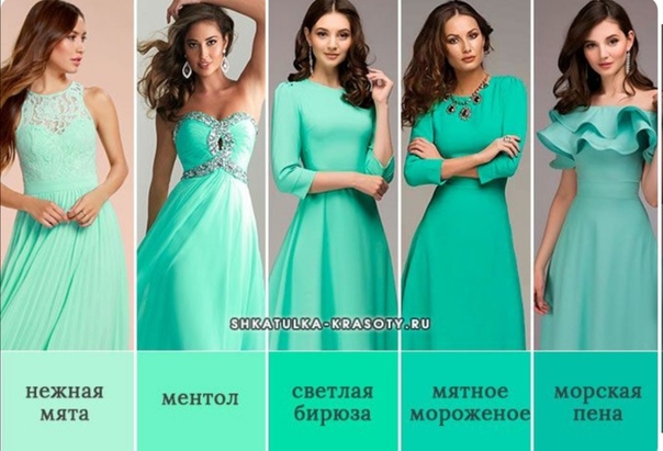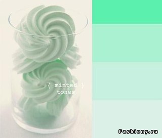 Мятный цвет приближен и к голубому, и к светло-зеленому. Мятных оттенков немало. Это и ментоловые, и бледно-бирюзовые, фисташковые тона, а также цвет морской пены. Мятный цвет можно увидеть в различных видах одежды и аксессуарах. Этот цвет придает свежесть и молодость, ощущение легкости и нежности, выгодно подчеркивает загар.