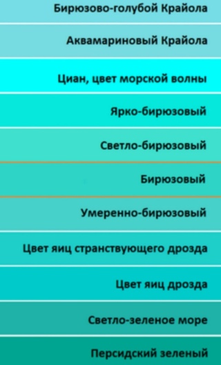 - бирюзовая мята — синеватый оттенок, средний цвет между небесным и изумрудным;