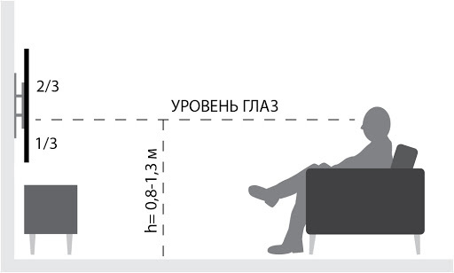 - На уровне глаз сидящего зрителя должна располагаться центральная точка дисплея, которая располагается на уровне трети от низа телевизора.