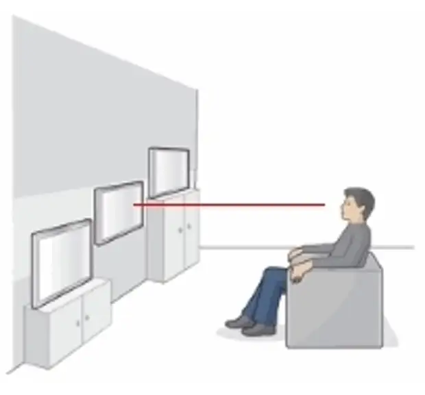 Высота телевизора от пола рассчитывается по условной прямой линии от уровня глаз смотрящего.