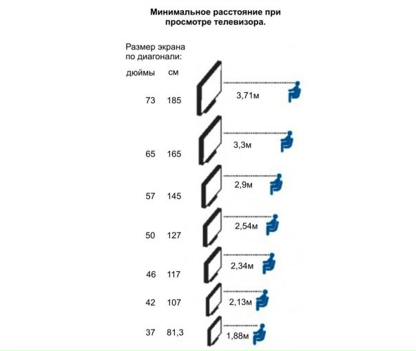 При этом важно расположиться сидя в удобной позе именно на той мебели, с которой будет идти телепросмотр. В итоге, размеры получаются условными. А дистанция до ТВ – минимальный показатель для хорошего восприятия картинки.