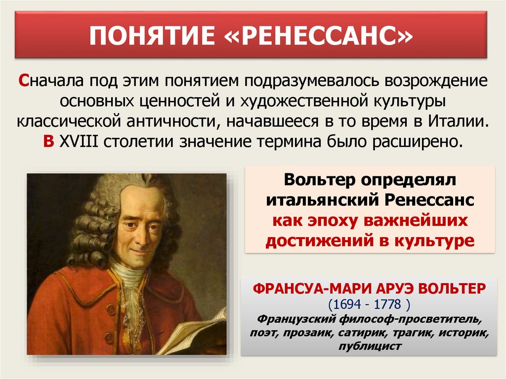 Взгляд эпохи Возрождения. Идея эпохи, ориентированной на возрождение лучших черт древней культуры, возникла у итальянского поэта Петрарки в середине 1300-х годов.Ученые 1400-х и 1500-х годов, особенно итальянцы, развили идеи Петрарки о Ренессансе и его веру в то, что это был уникальный период истории.