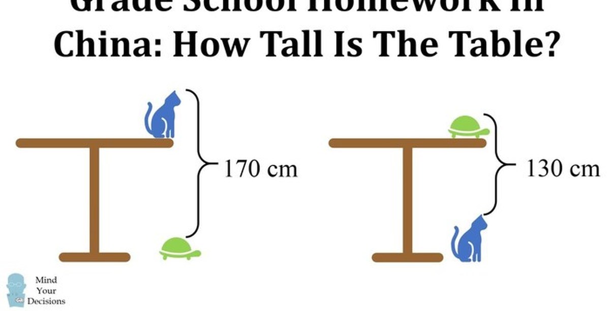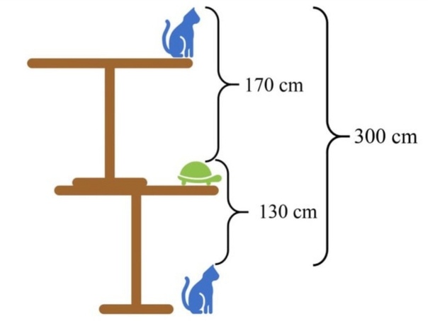 Задание звучит следующим образом: «Найдите высоту стола, зная, что расстояние между головой кота на столе и головой черепахи на земле составляет 170 см, а расстояние между головой черепахи на столе и головой кота на земле составляет 130 см».