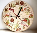 В этом случае оформление и изготовление настенных часов проводится с использованием готового магазинного шаблона. Он включает заготовку, основу стрелок, и готовый механизм. Кроме того, часы можно декорировать с помощью готовых узоров на бумаге, специальных красок, клея, и других элементов декупажа.настенные часы своими руками-декупаж