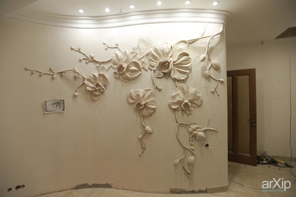 Одним из способов сделать обстановку неповторимой является создание барельефов. Такую работу сложно назвать ремеслом, скорее это искусство, требующее индивидуального подхода и наличия определенных навыков. Материалом для лепных картин являются гипс или штукатурка, а кисти заменяет обычный шпатель. Для некоторых элементов используются шаблоны. Мелкие листочки, лепестки, прочие детали сначала отливают из гипса, а затем уже вживляют в композицию.