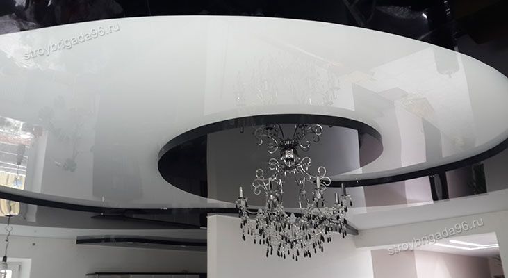 Хорошо смотрится и сочетание глянцевого черного полотна с гипсокартонными вставками. Можно использовать как резкие, так и округлые линии — все зависит от вашей задумки.