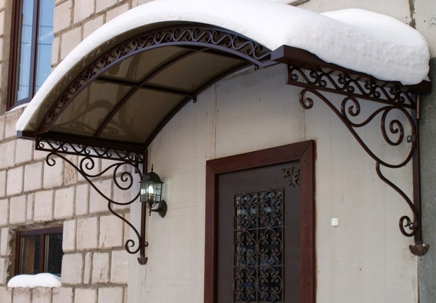 Отдельно стоит обратить внимание на такую разновидность металлических козырьков, как кованые. Эти навесы всегда исключительно роскошны и элегантны. Они отлично вписываются в экстерьеры, оформленные в классическом стиле, демонстрирует вкус и статус владельцев особняка.