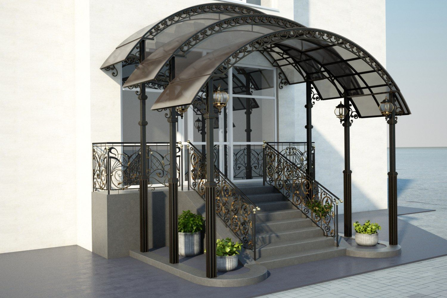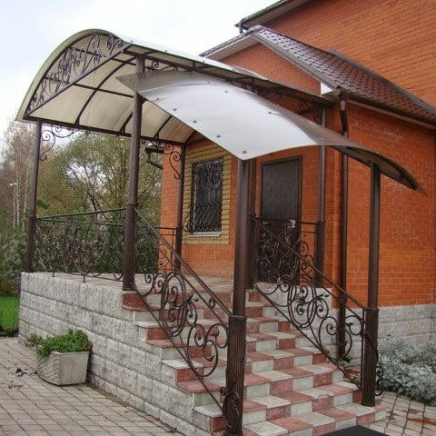 Навесы над входом в дом, коттедж, офисное помещение, магазин, торговый центр — это легкая и прочная металлическая конструкция. Навес над входом необходим для защиты входной двери и ступенек от дождя, снега. Навесы над входом можно изготовить односкатные и двускатные, арочного и полуарочного типа, а также можно изготовить навес сложных необычных форм, так как металлу можно придавать различные формы.