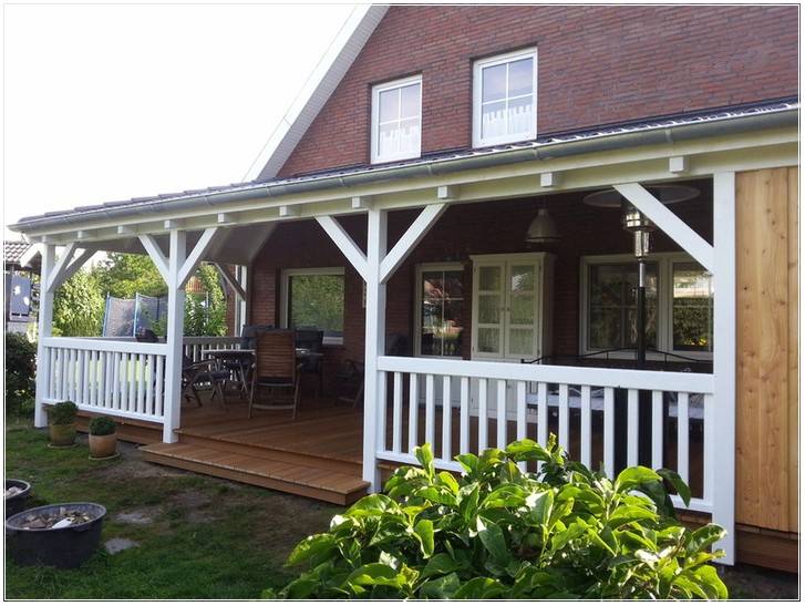 · Самый популярный и просто в выполнение – это навес. Он может представлять собой отдельное строение, например – навес для автомобиля, и состоять из крыши – плоской или криволинейной, и опорных столбов. Другой вариант – пристроенный навес. В этом случае одним концом он закрепляется на стене дома, а второй опирается на колонны. Таким образом сооружают крытое крыльцо или открытую площадку для отдыха.