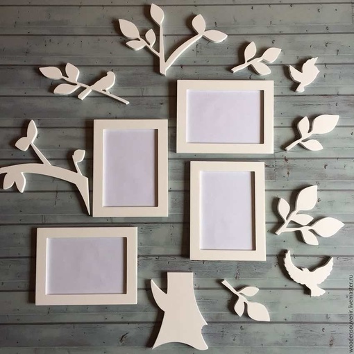 - Семейные, с большим количеством ячеек, в виде семейного дерева или объединенные модными выпиленными из беленого дерева словами “Family/Семья”, “Love/Любовь”.