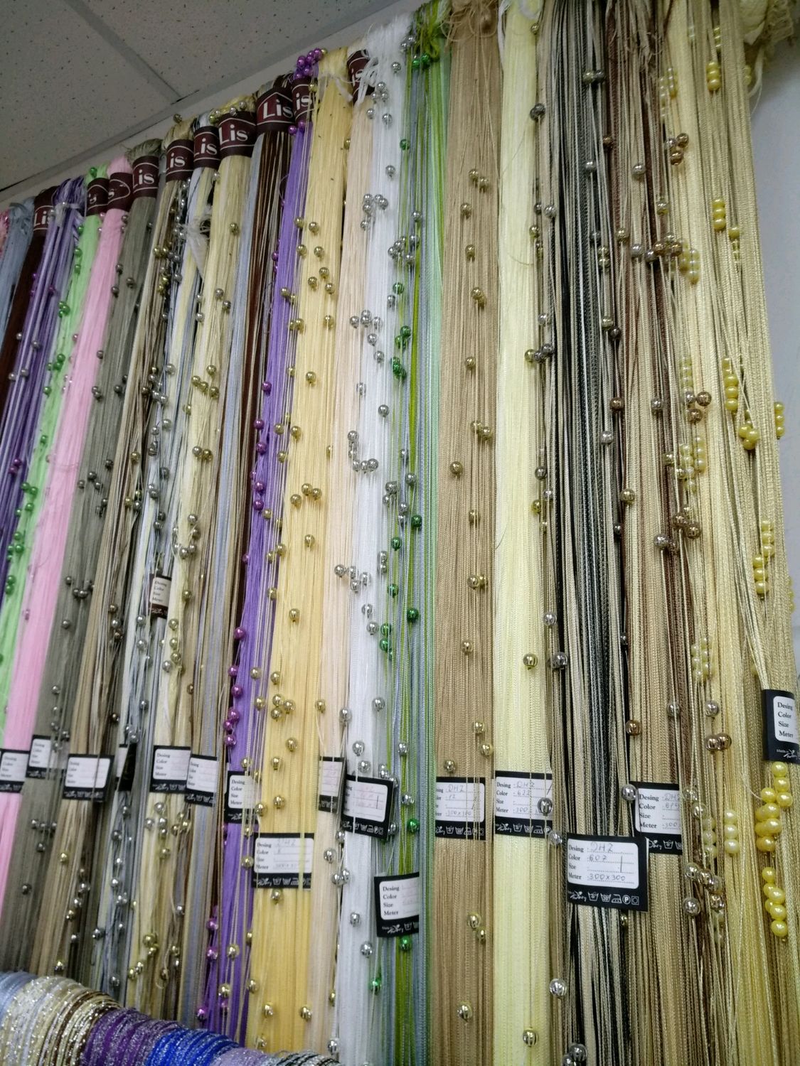 Существует богатая гамма цветовой палитры. Если нитяные шторы делать своими руками, то можно прибегнуть не только к натуральным материалам, но и к искусственным, которые стоят намного дешевле, а по качеству не уступают натуральным материалам. Декорировать кисею можно бусинками, стразами, стеклярусой, любыми другими материалами, в зависимости от воображения декоратора. Вариантов для украшения множество.