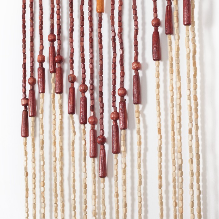 Хорошим вариантом для зонирования помещения, благодаря внешней привлекательности, являются шторы на дверь из дерева. Они состоят из вертикальных нитей с прикрепленными декоративными элементами из дерева. Подобные детали могут выглядеть как бусины квадраты, палочки или иметь другие формы.
