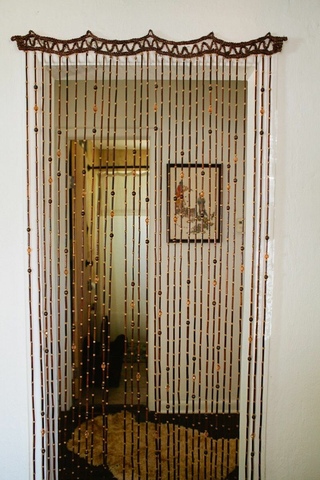 Для собственного изготовления таких штор можно использовать пряжу или красивые гладкие нити.Каким будет декор, думаем сами — может бусинки, может бахрома. Используются колокольчики, ракушки и перья. Шторы из пряжи будут тяжелыми, а из гладких ниток — достаточно легкими.