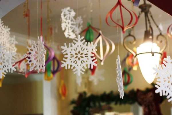 Самый простой, но вариативный декор — снежинки из белой или цветной бумаги. Узорные фигуры можно приклеивать к окнам и стенам, создав композицию с рисунками или тематическими наклейками. Из снежинок делают вертикальные и горизонтальные гирлянды, которыми украшают окна, двери, абажуры, потолок. Чтобы бумажная поделка была ярче, её можно раскрасить или декорировать блёстками.