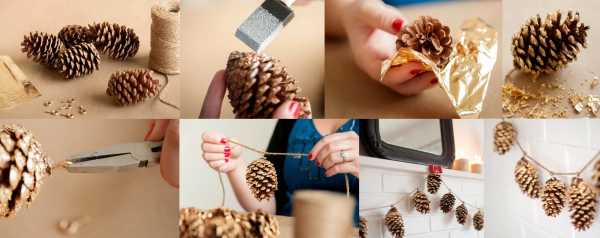 Маленькую елочку можно сделать из шишки. Для этого ее нужно покрасить в зеленый цвет и украсить бусинками. Большая елка также изготавливается из шишек. Для этого из плотного картона сворачивается конус, а затем к нему приклеиваются слегка подпиленные шишки, которые предварительно окрашиваются в золотистый или серебристый цвет. Елка из шишек украшается дождиком, лентами или бусинками.