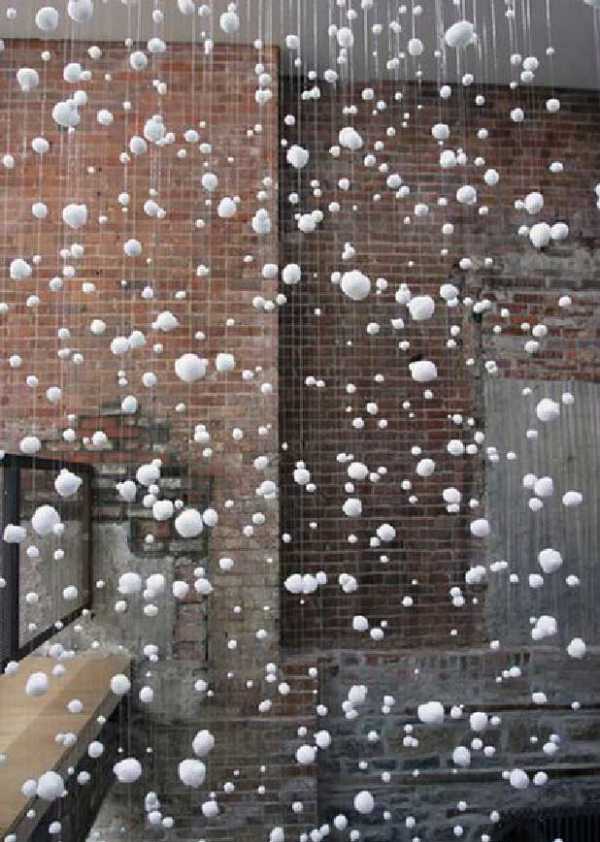 Можно украсить комнату и иной разновидностью гирлянды – занавесью. Таким образом создают имитацию легкого снегопада в комнате. Для этого следует взять небольшие кусочки ваты, слегка смочить их в клее ПВА (для удержания формы) и нанизать их на нитку на разной высоте. Желающие могут окрасить комочки ваты в различные цвета, соответствующие окружающему декору. Для того, чтобы нити держались ровно, можно привязать какой-либо утяжелитель – в этом качестве идеально подойдут небольшие колокольчики или шишечки.