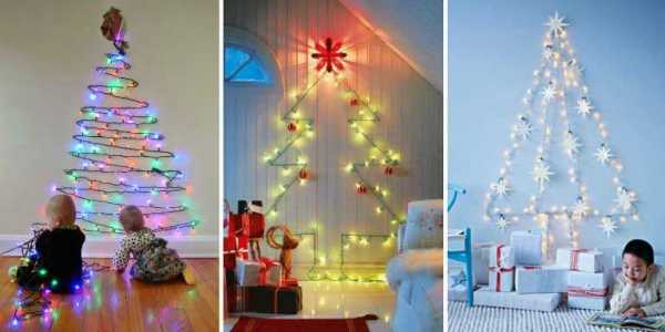 Однако совсем необязательно новогодняя ель должна быть традиционной. Ее можно соорудить из чего угодно – из мишуры или электрогирлянды, закрепленной на стене в виде деревца.
