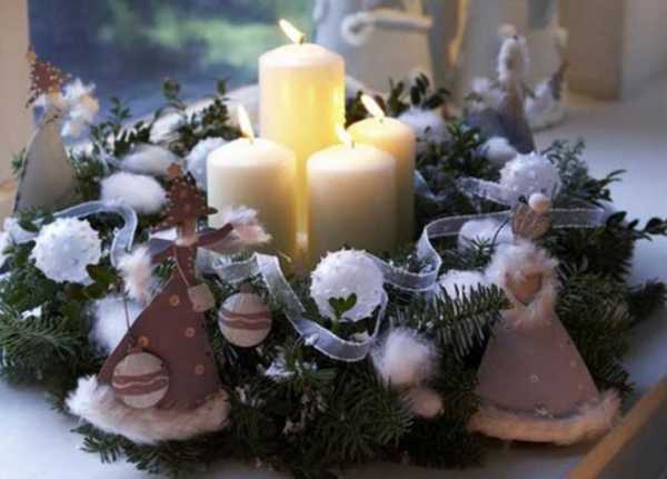 Так, не обойтись без красивых хвойных композиций, которые идеально подойдут для декора стола. Чтобы сделать такое украшение, потребуется подготовить пиафлор, куда будут укладываться веточки хвои, а центром композиции станет свеча. Акцент на новогодней тематике можно сделать с помощью пенопласта или блесток, которыми имитируется снег.