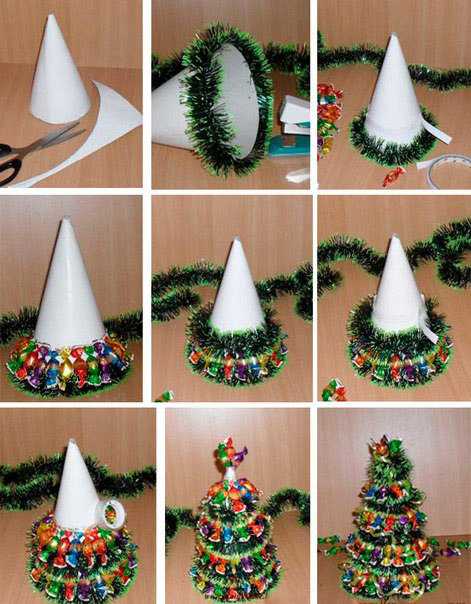 Приложив совсем немного фантазии (или подсмотрев идеи в Интернете), можно самостоятельно изготовить новогоднюю елку из любых подручных и вполне доступных по цене материалов. Например, взять лист картона, свернуть из него конус, склеить его по линии соприкосновения или обмотать скотчем.