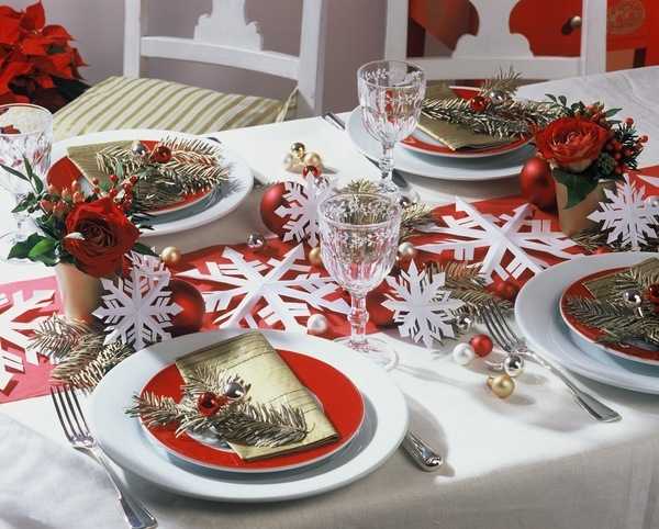 Если речь идет о новогодней ночи, то тут следует пристальное внимание уделить оформлению стола. При сервировке стоит учесть множество мелочей, начиная с выбора скатерти и заканчивая продуманным расположением салфеток, сшитыми из ткани на новогоднюю тематику. Центр стола красиво дополнит новогодняя икебана или композиция из свечей, а по всему столу целесообразно разложить декоративные элементы с использованием елочных шаров, бус, конфет, шишек и мандаринов. Обычные бокалы засияют новыми красками и новогодним настроением, если дополнить их морозными узорами, выполненными акриловыми красками или сахаром.
