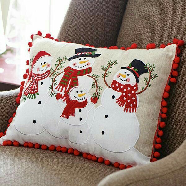 Снеговики на новогодних подушках так же естественны, как ёлки и Дед-Морозы. Воспользуемся всё той же аппликацией. Её можно сделать даже вручную: аккуратными стежками сделайте для своей подушки, например, такое украшение: