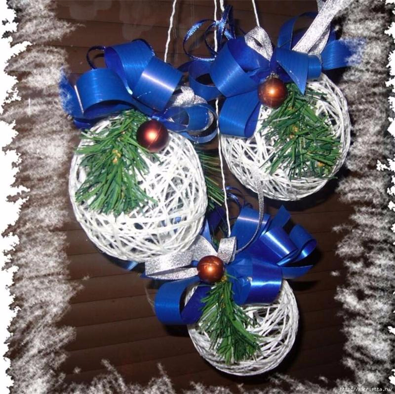 Нитками обматывают и пенопластовые шары, дополняя украшение декоративными элементами.